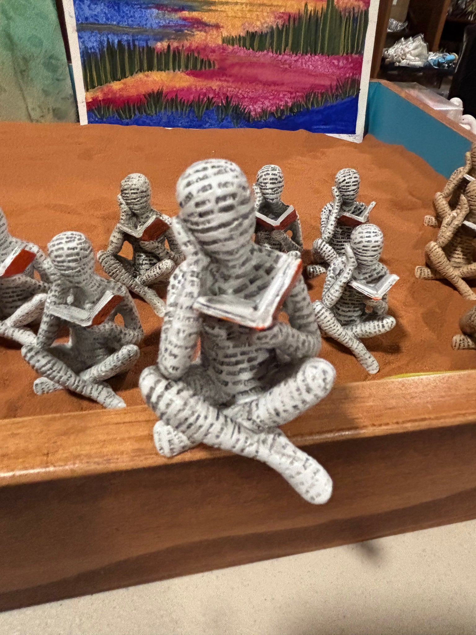 These readers are sitting with legs crossed, knees up and hand on face as if deep in the story or thinking hard. Great symbolism in this figure.