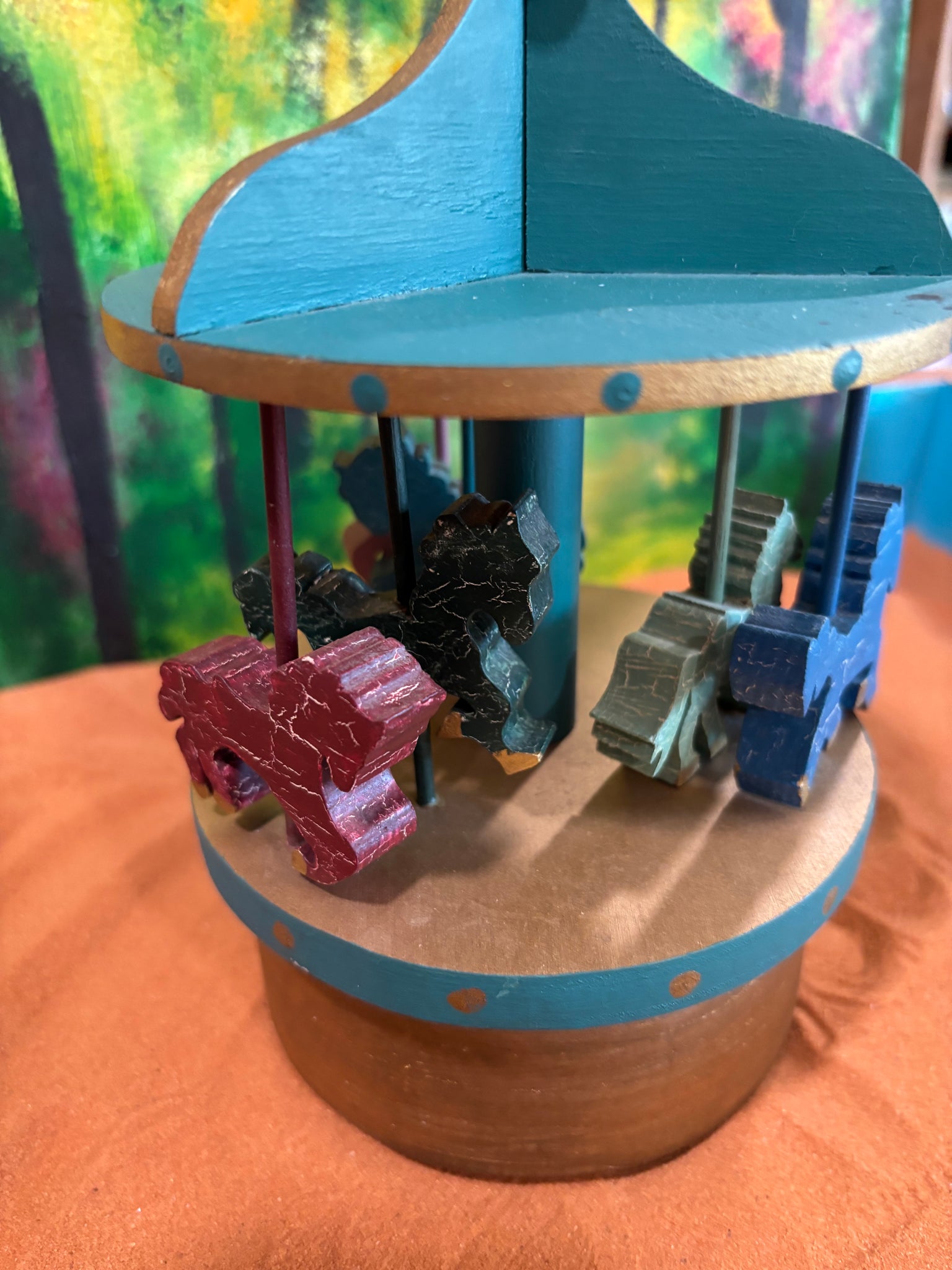 8” tall beautiful Vintage handmade musical wood Horse Carousel. Plays “ It’s a Small World”