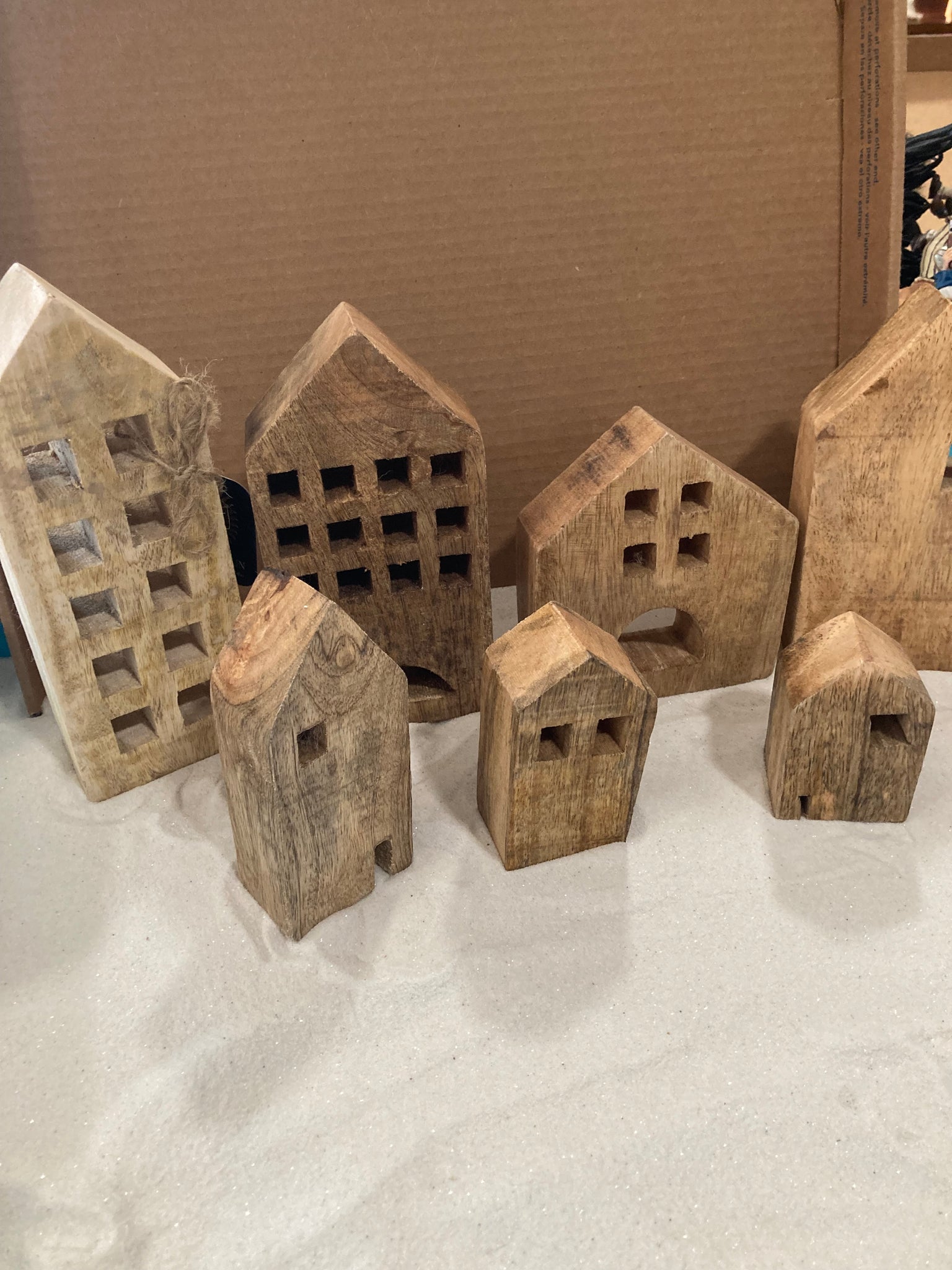 Gorgeous Creative Co-op 7 piece high quality wood buildings. These are rustic and primitive. They range from approximately 3”-7” tall. A set like this would last a lifetime used for Sand Therapy.