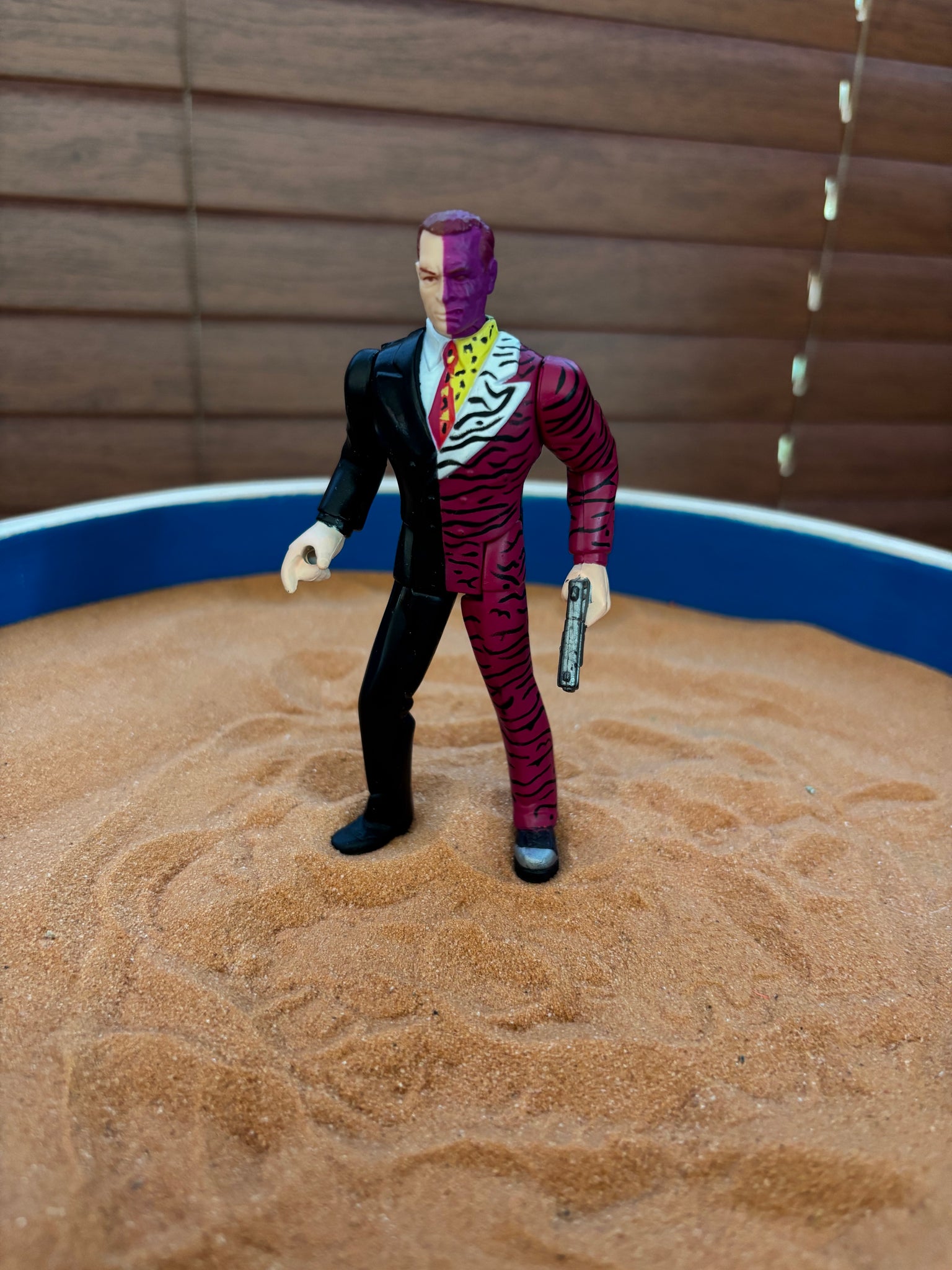 The image shows a Two-Face action figure from the 1995 movie Batman Forever. The figure was produced by Kenner. Collectible