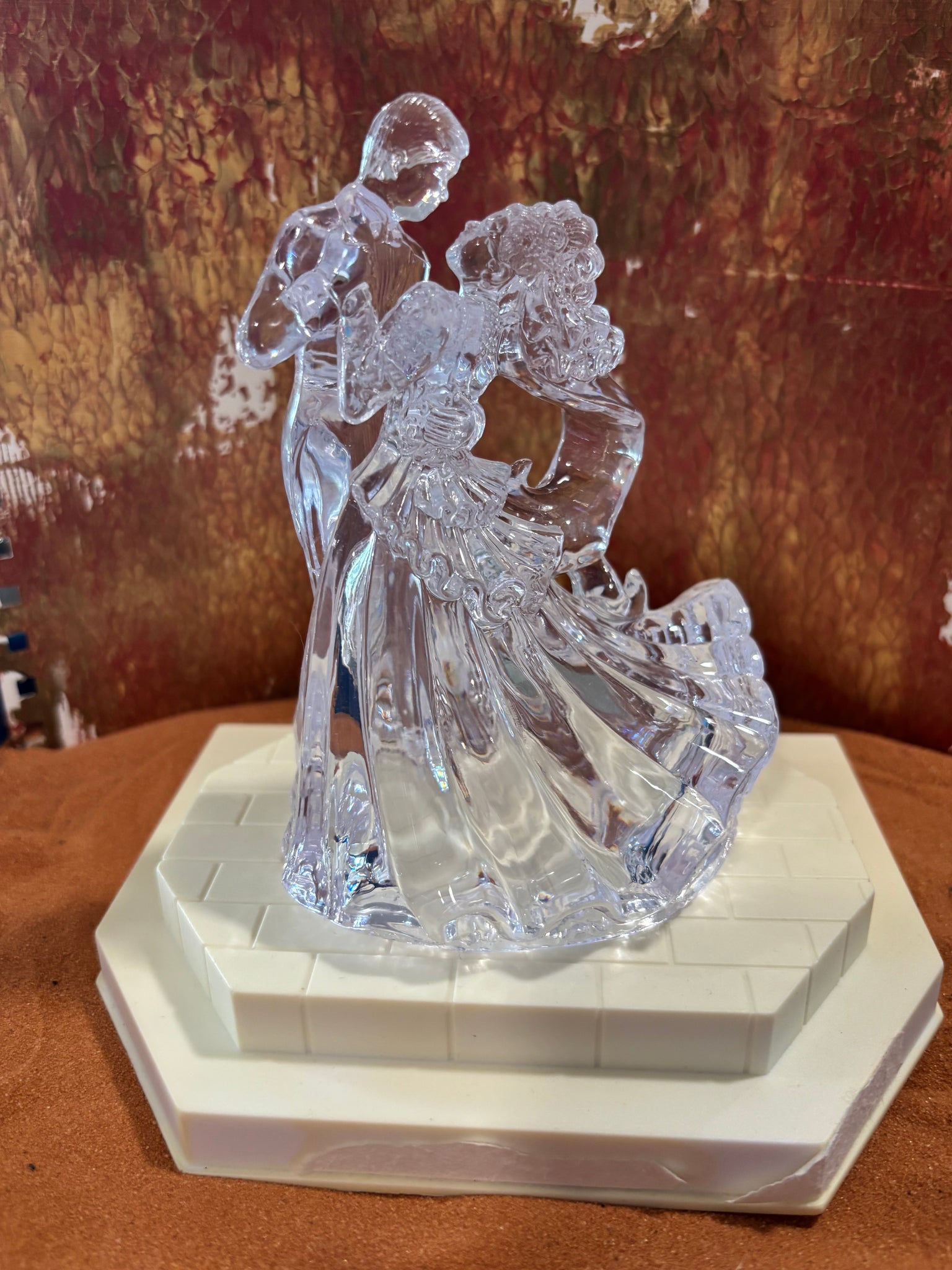 Vintage Wilton cake top new in box with platform. 5” tall clear acrylic couple